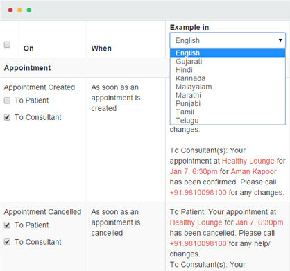 Speak the language of your patient: Send SMS in popular regional language including Hindi, Marathi, Gujarati, Punjabi, Telugu, Tamil, Kannada, and Malayalam.